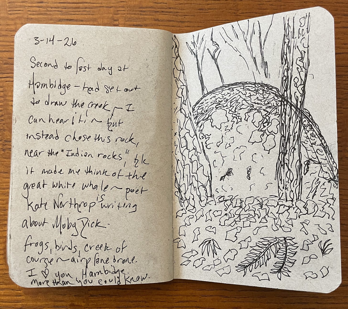 One of the domains I embraced creatively at Hambidge was drawing. I’ve done this at Hambidge before; I made graphic journals at Hambidge the week I visited in 2024. But 4-8 panels takes SO LONG! This time, inspired by the BORED AND BRILLIANT challenge to not take pictures, I committed to a daily drawing while I hiked. This is one inspired by Hambidge fellow and poet Kate Northrop. (My handwriting is super messy because I’m writing and drawing standing up).