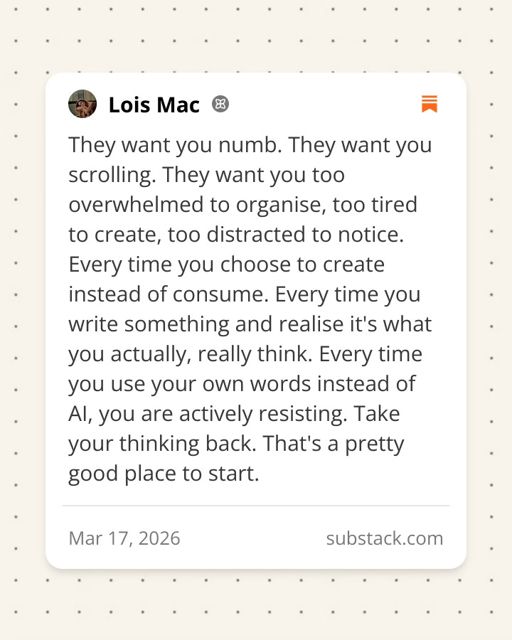 Fellow Substacker Lois Mac put it best: